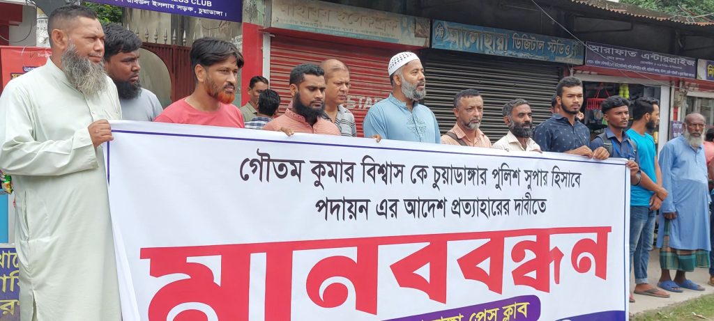মানববন্ধনে অংশ নিয়ে বক্তারা বলেন, সম্প্রতি চুয়াডাঙ্গায় পদায়ন করা পুলিশ সুপার গৌতম কুমার বিশ্বাস বিগত সরকারের ফ্যাসিস্ট আওয়ামী লীগের দোসর হিসেবে চিহ্নিত।
