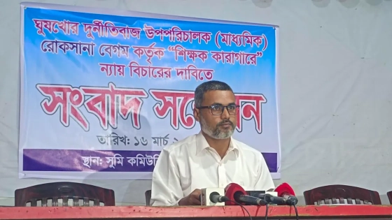 সোমবার (১৬ মার্চ) বিকেলে রংপুর নগরীর সুমি কমিউনিটি সেন্টারে সংবাদ সম্মেলন করে এমন অভিযোগ করেন মাইদুল ইসলাম। এর আগে গত ১৬ ফেব্রুয়ারি নগরীর কাচারিবাজার এলাকায় মাধ্যমিক ও উচ্চশিক্ষা আঞ্চলিক কার্যালয় থেকে ঘুষের টাকাসহ পুলিশ তাকে আটক করে থানায় নিয়ে যায়। পরে ১৮ দিন কারাভোগ শেষে তিনি জামিনে মুক্ত হন।