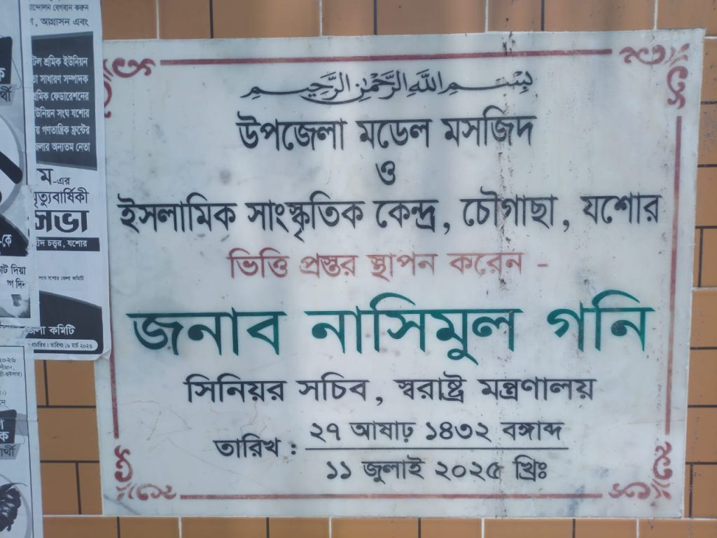 যশোরের চৌগাছায় মডেল মসজিদের ভিত্তিপ্রস্তর স্থাপনের আট মাস পার হলেও এখনো নির্মাণ কার্যক্রম শুরু হয়নি। গত বছরের ১১ জুলাই তৎকালীন অন্তবর্তীকালিন সরকারের স্বরাষ্ট্র সচিব এবং বর্তমান সরকারের মন্ত্রিপরিষদ সচিব নাসিমুল গনি মসজিদটির ভিত্তিপ্রস্তর স্থাপন করেন। সংশ্লিষ্ট সুত্রে জানাযায়,চৌগাছা শহরে একটি মডেল মসজিদ নির্মাণের জন্য ২০২৩ সালের ৩১ আগষ্ট দরপত্র আহবান করে গণপূর্ত অধিদপ্তর। নির্মাণের জন্য ডিপিপি মুল্য দেওয়া হয় ১৪ কোটি ৯৯ লক্ষ ৬৯ হাজার টাকা। যশোর উপশহরের ঠিকাদারি প্রতিষ্ঠান এসআই একেজে পিসি ১৪ জানুয়ারি ২০২৪ তারিখে কাজটি সম্পন্ন করার জন্য ১৩ কোটি ৯৭ লক্ষ ৫৩ হাজার টাকায় চুক্তিবদ্ধ হয়। চুক্তি অনুযায়ী ঠিকাদারি প্রতিষ্ঠান ২০২৬ সালের ৩০ জুন তারিখের মধ্যে কাজটি সম্পূর্ণরুপে শেষ করে দিবে। কিন্তু চৌগাছা উপজেলা প্রশাশন ও ইসলামিক ফাউণ্ডেশন দীর্ঘদিনেও ঠিকাদারি প্রতিষ্ঠানকে মসজিদ নির্মাণের জায়গা হস্তান্তর করতে ব্যর্থ হয়। স্থানীয় সূত্রগুলো জানায়, মসজিদ নির্মাণের জন্য স্থান নির্ধারণে শুরু থেকেই নানা জটিলতায় পড়ে উপজেলা প্রশাসন। পরে এলাকাবাসীর জোর দাবির মুখে চৌগাছা শহরের প্রাণকেন্দ্রে সরকারি শাহাদৎ পাইলট মাধ্যমিক বিদ্যালয়ের জমিতে (বর্তমান কাঁচাবাজারের দক্ষিণ-পশ্চিম কোণে) মসজিদ নির্মাণের জন্য ২৮ হাজার ৬’শ ৮৫ বর্গফুট জায়গা নির্ধারণ করে দেওয়া হয়। মসজিদের জায়গা নির্ধারণের সময় উপজেলা বিএনপির সভাপতি এম এ সালাম, সাধারণ সম্পাদক মাসুদুল হাসান, উপজেলা জামায়াতের আমীর মাওলানা গোলাম মোরশেদ, সেক্রেটারী অধ্যাপক নুরুজ্জামান, সহকারী সেক্রেটারী মাস্টার কামাল আহমেদসহ উপজেলার প্রশাসনের কর্মকর্তা ও স্থানীয় সকল পর্যায়ের গন্যমাণ্যদের নিয়ে সিদ্ধান্ত নেওয়া হয়।