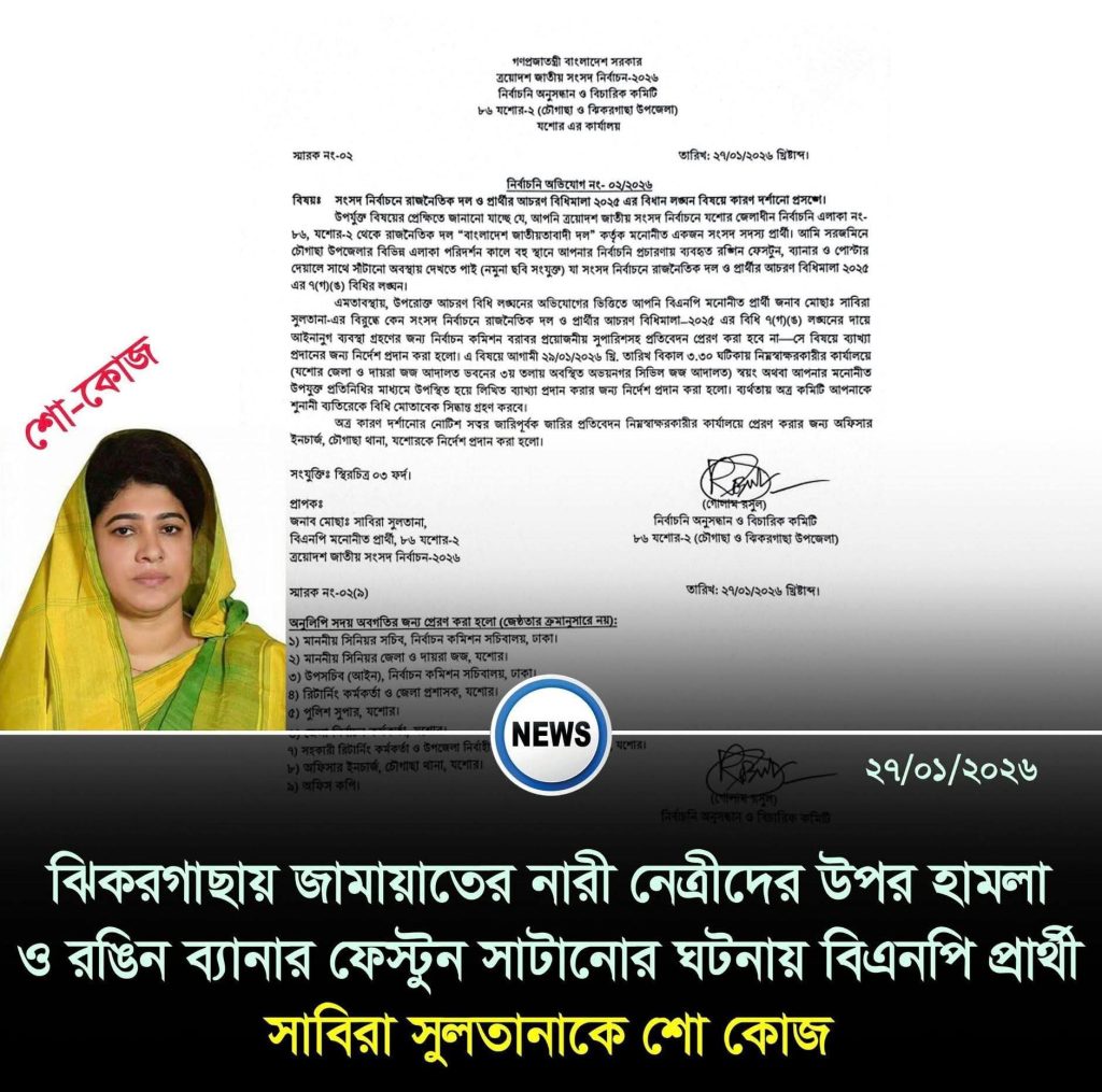 যশোর-২ ধানের শীষের প্রার্থীকে শোকজ